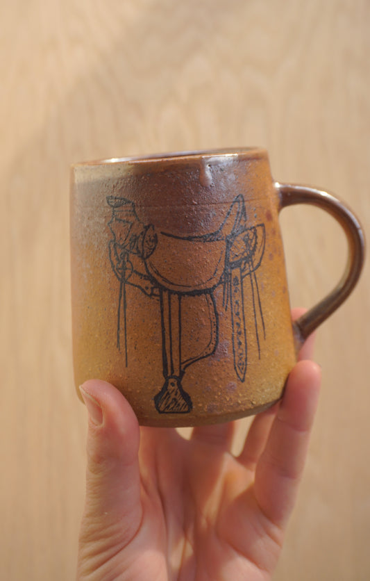 These mugs were hand painted with underglaze and then woodfired to approximately 2350 degrees F. A bit of flashing slip and/or glaze was applied to the outsides of these mugs, giving them a mostly bare clay look that interacted with the flames of the kiln. The handles and insides of the mugs were glazed with shinos to provide some toasty warm earth tones.